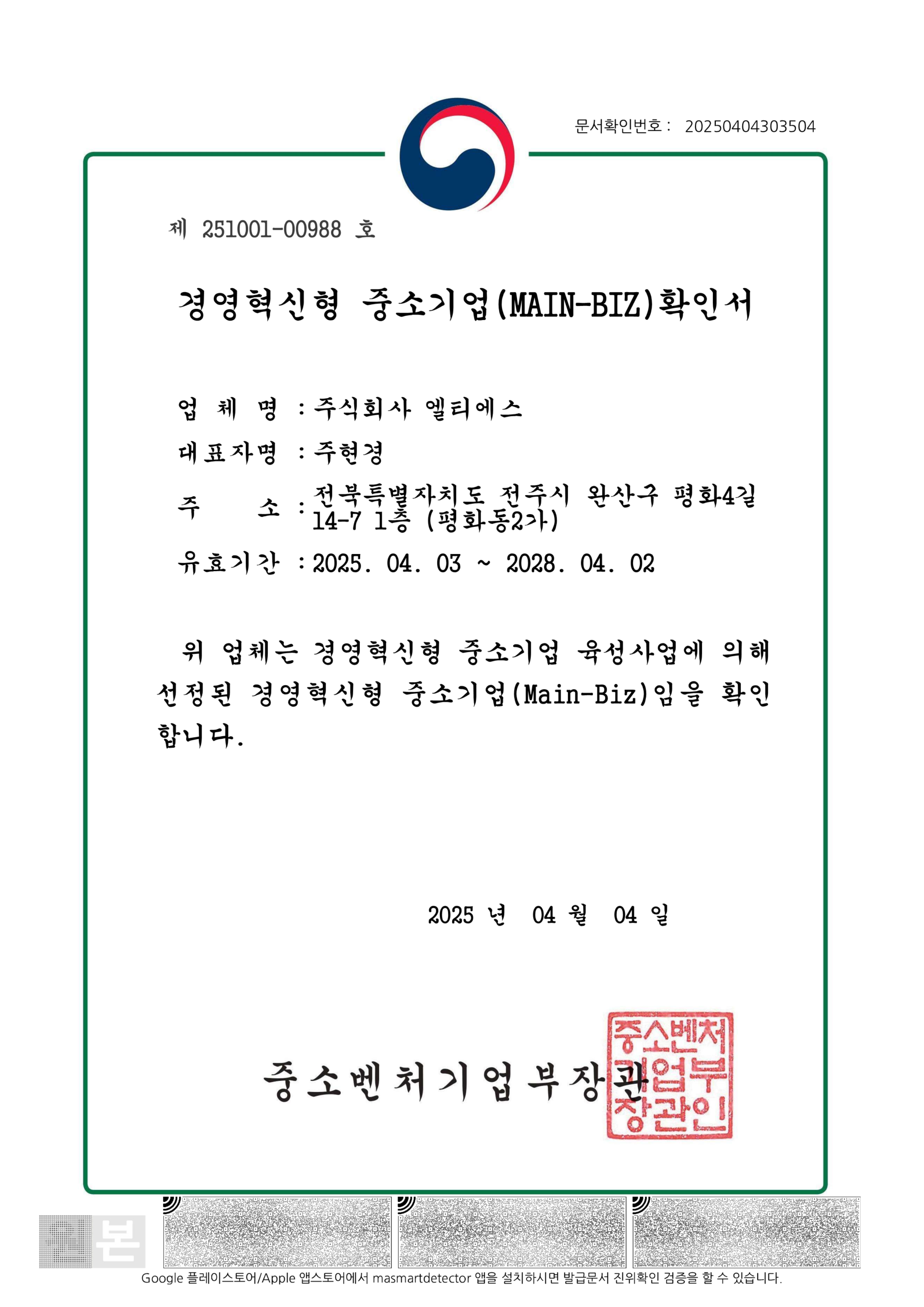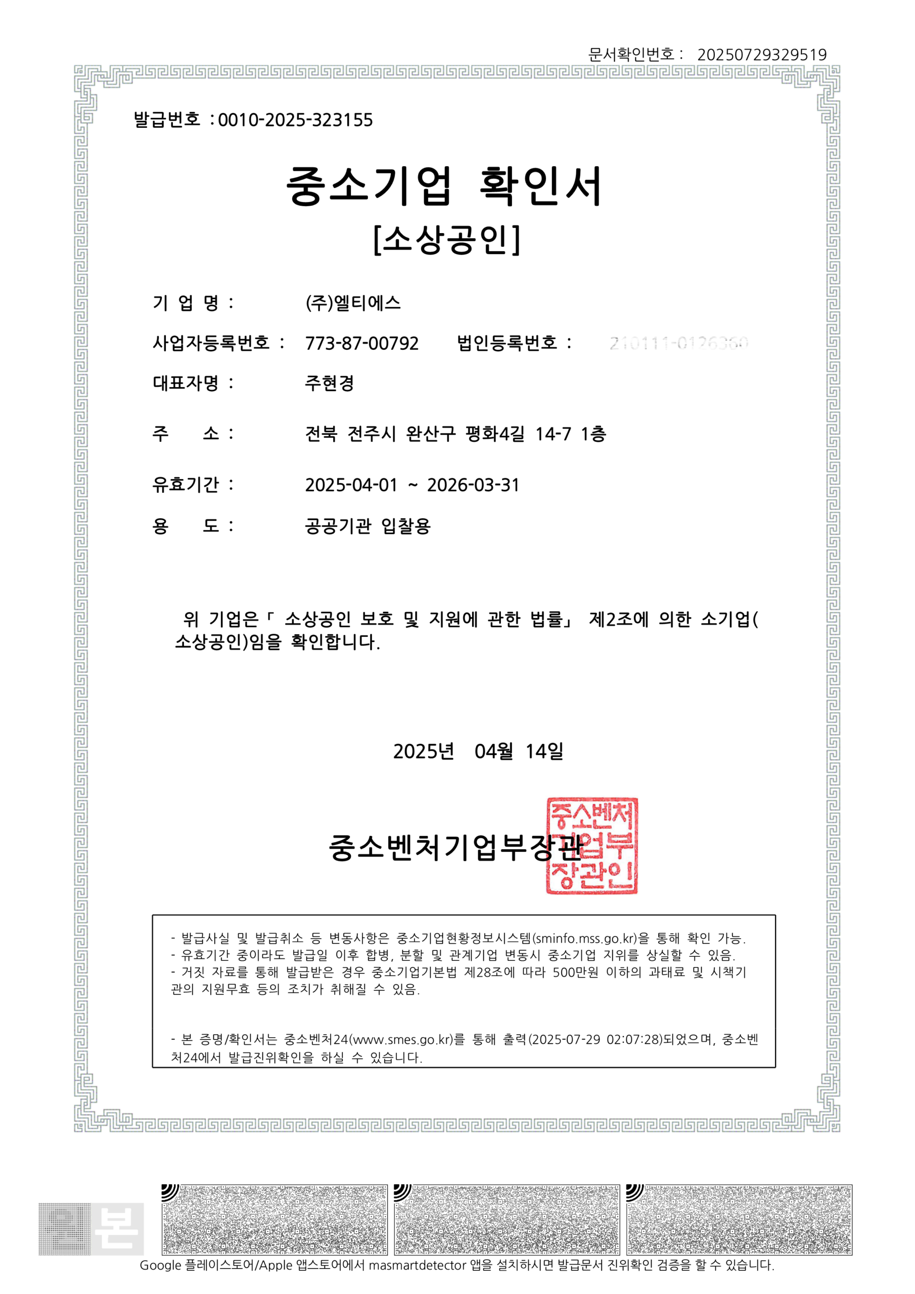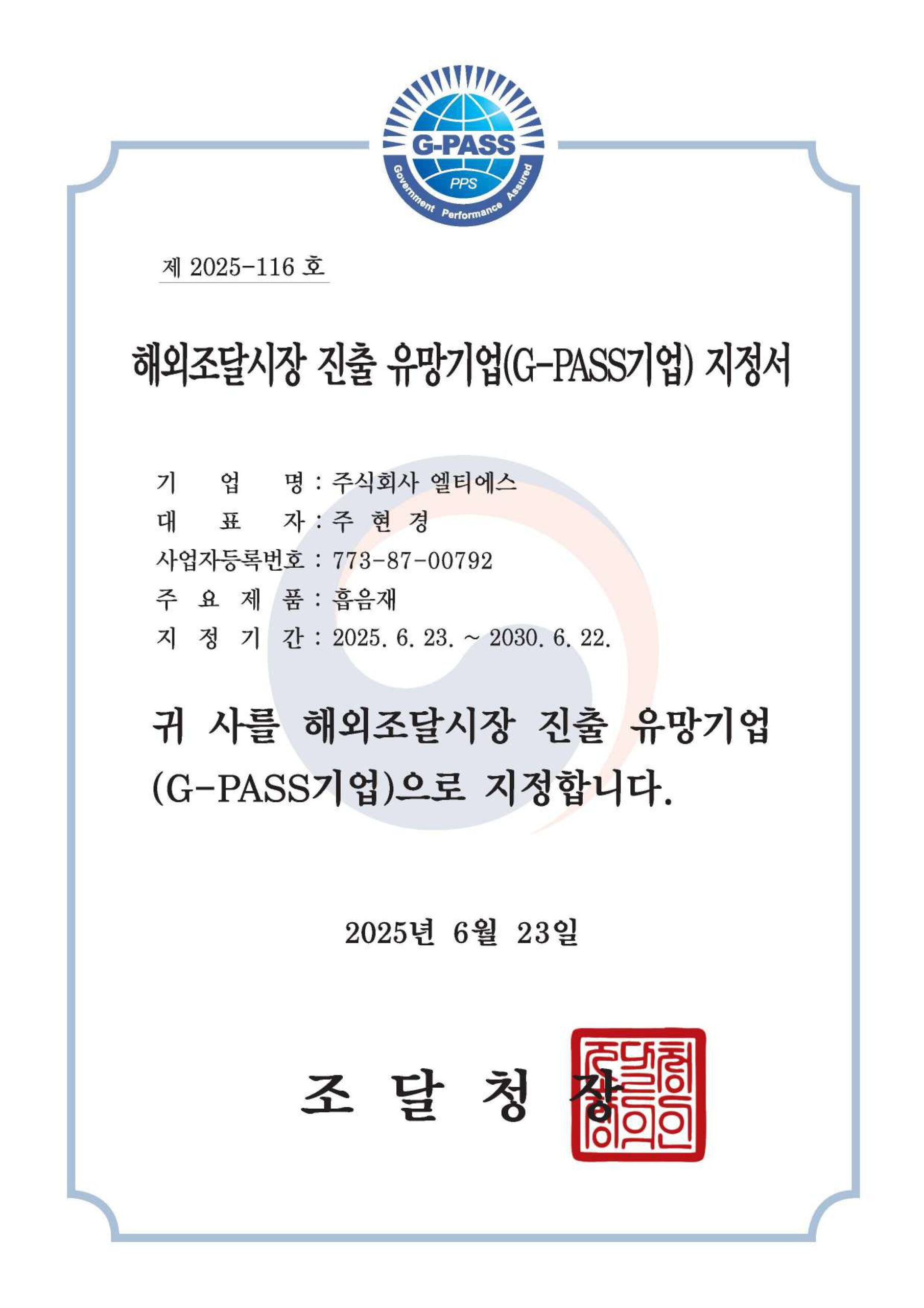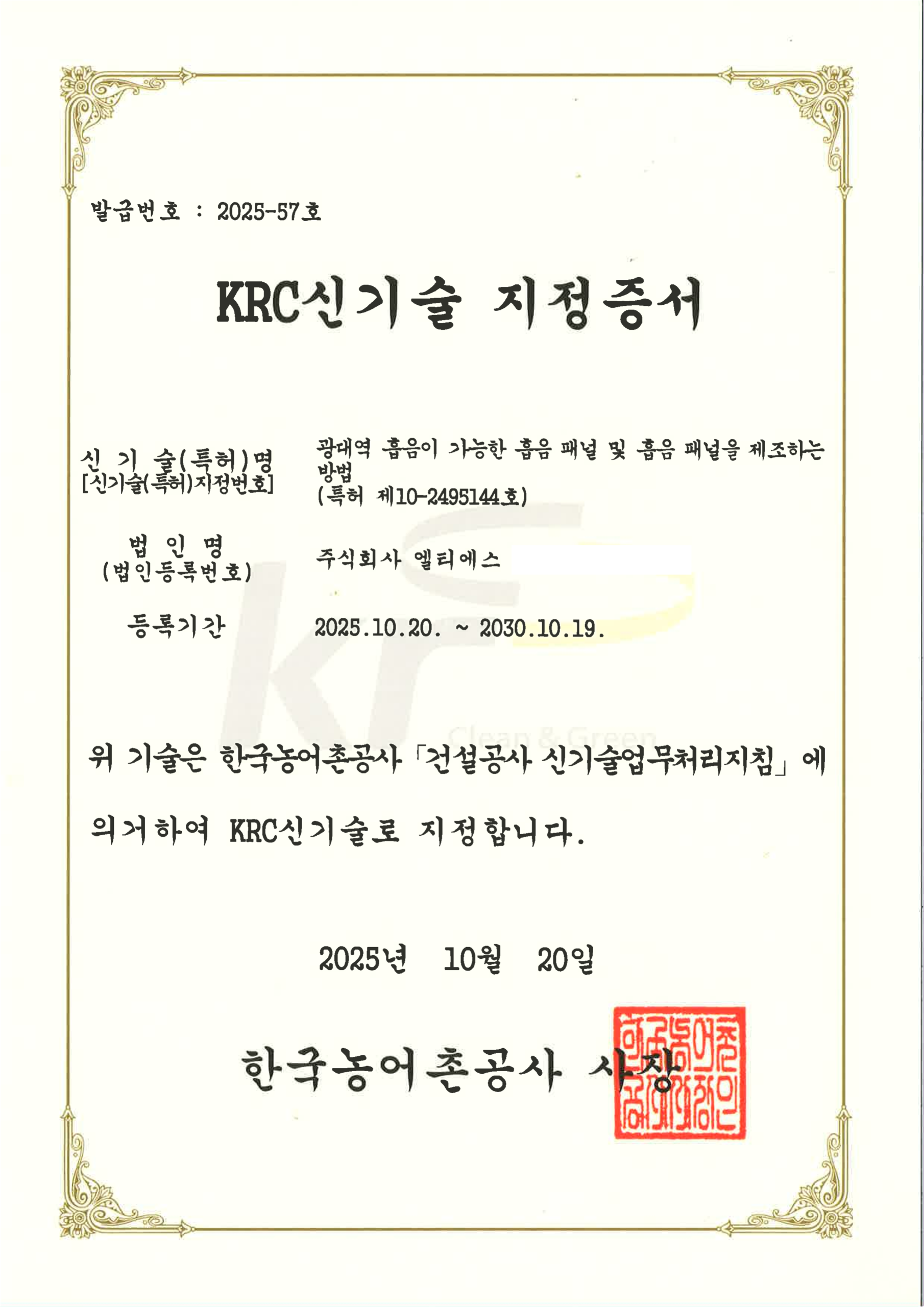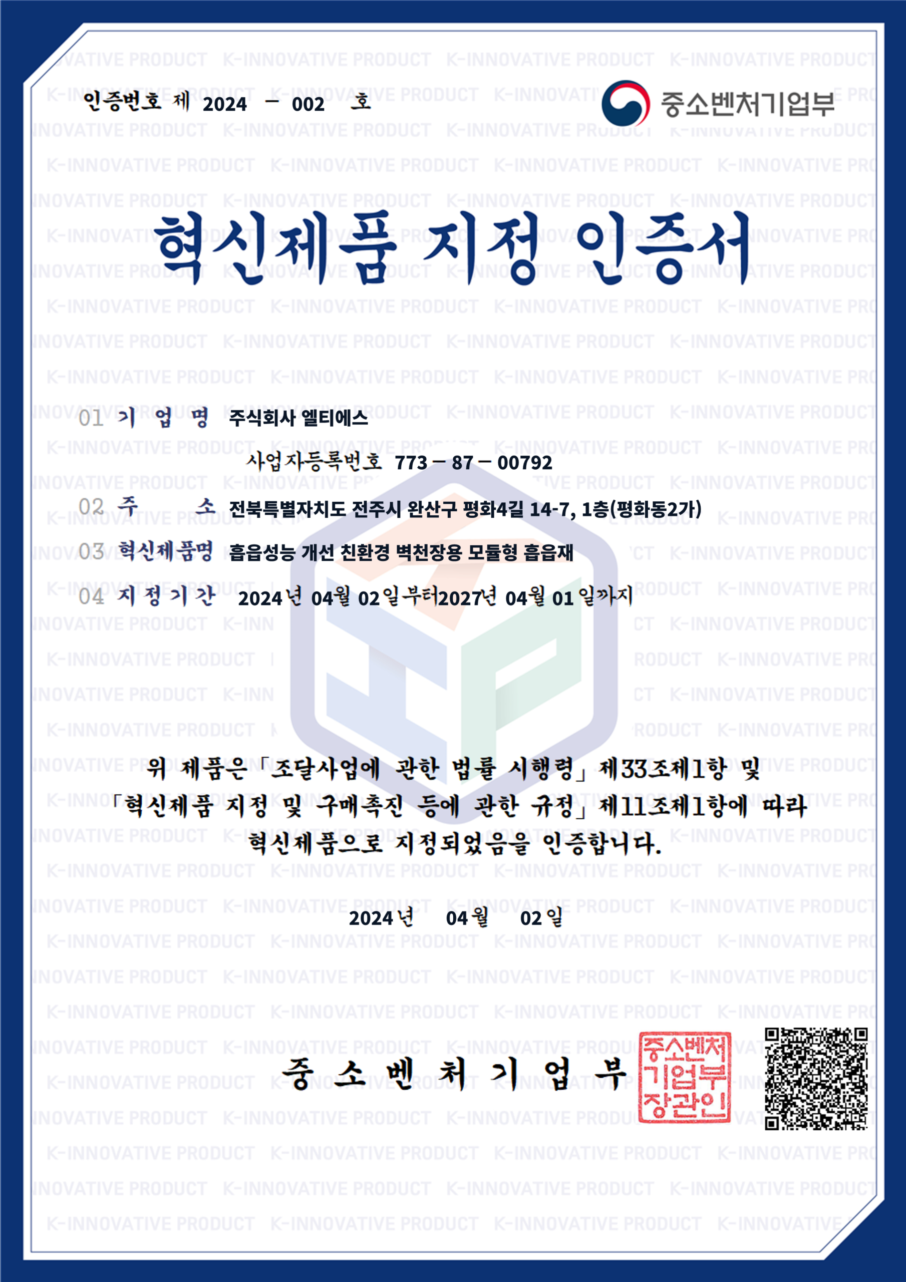 Certificates 제품 특장점 탄소저감 친환경제품 폐페트병 재활용TVOC, 유해물질 불검출 쉬운 설치 부자재, 현장가공 없는간단한 설치 편리한 유지관리 해당 모듈만 교체 혁신적 흡음성능 개선 유사소재 제품의 2배 성능 구현 시험성적서 방염성 시험성적서 유해가스성 시험성적서 시험성적서_방염시험 시험성적서_열전도율 인 증 혁신제품 지정 인증서 기술혁신형 중소기업 확인서 환경표지 인증서 여성기업확인서 해외조달시장 진출 유망기업 지정서 공장등록증명서 중소기업확인서 벤처기업확인서 조달청벤처나라지정증서 우수디자인(GD) 상품선정 KRC 신기술 지정증서 ISO9001 인증서 소재·부품·장비 전문기업확인서 경영혁신형 중소기업 확인서 기업부설연구소 인증서 중소기업기술마켓 인증서